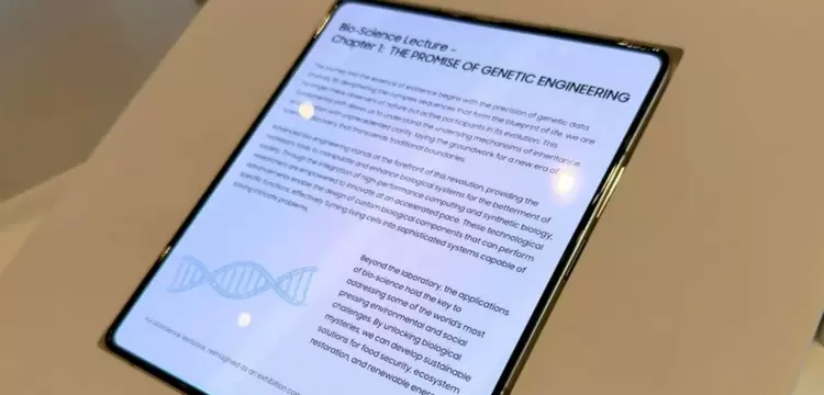 三星展示了采用无折痕显示屏的演示机照片,这款未命名的三星设备完全展开平置于桌面上。从图片的角度观察,屏幕未见任何折痕,但目前尚未披露三星实现此项突破的技术细节。多年来,三星持续将其折叠屏智能手机做得更轻薄,但始终未能消除折痕。那如今究竟是怎么取得了突破呢?