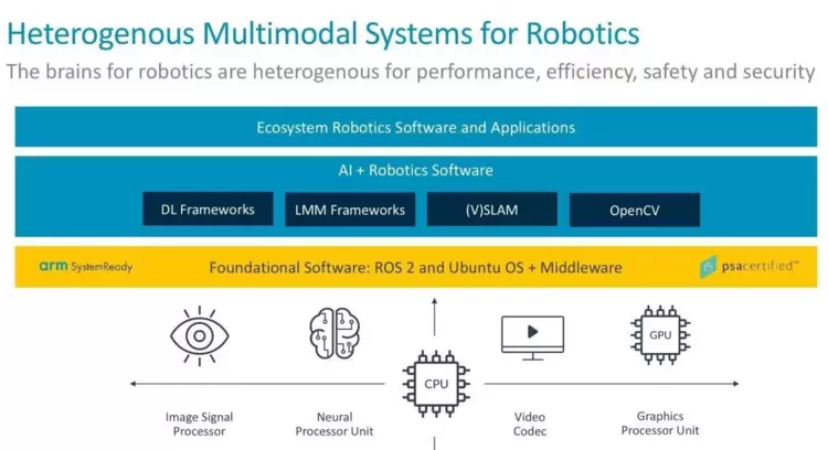 当扩展到机器人软件堆栈时,操作系统层可能还需要一个能够可靠处理时间关键型任务的实时操作系统(RTOS),以及针对机器人定制的Linux发行版,如ROS,它可以提供专为异构计算集群设计的服务。我们相信,SystemReady和PSA Certified等由Arm发起的标准和认证计划将帮助扩大机器人软件的开发规模。SystemReady旨在确保标准的Rich OS发行版能够在各类基于Arm架构的系统级芯片(SoC)上运行,而PSA Certified有助于简化安全实现方案,以满足区域安全和监管法规对互联设备的要求。