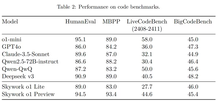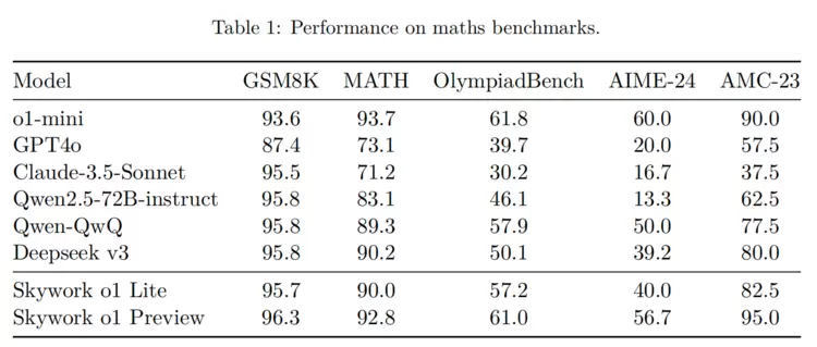 可以看出,在数学、代码基准测试中,Skywork o1的能力表现逼近o1-mini,显著优于行业常规通用大模型。