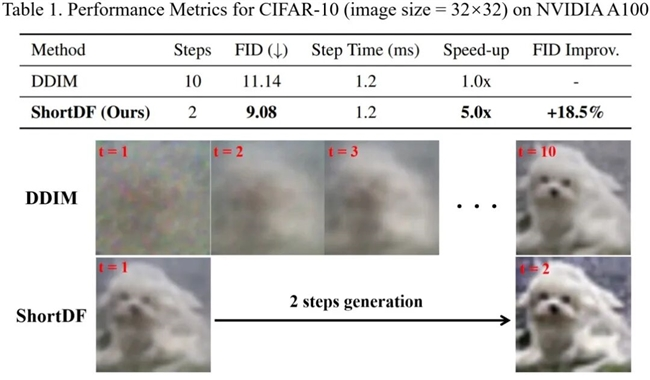 ShortDF在多个业界主流基准数据集上均取得了显著性能提升,其中在CIFAR-10数据集上的表现尤为突出:原本需要10步生成的DDIM图像,ShortDF仅用2步即可完成,实现了约5倍的速度提升,同时图像清晰度(FID指标)提升18.5%,对比如下所示: