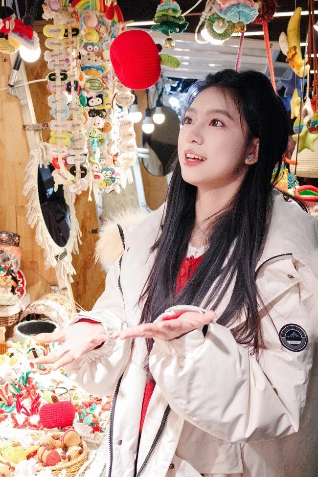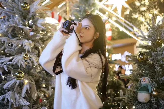 肤色呈现出自然的暖调红润感,搭配圣诞主题的红色毛衣,衣服的正红色和背景里彩色针织圣诞树的色彩层次分明,不用懂“色彩搭配”,R100 的色彩调校会帮你把人像和场景氛围完美融合。