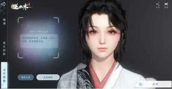 央视的报道中也重点展示了《逆水寒》手游的捏脸玩法,除了图片捏脸,还有最新的文字捏脸玩法:玩家只需输入的文字,三秒之内即可输出符合文字描述的结果。不仅仅包括“浓眉大眼”这样浅显的表面描述,像传统诗词文学“春风拂槛露华浓”这样抽象的气质描写,通通都可以生成符合中式美感与意境的捏脸结果。
