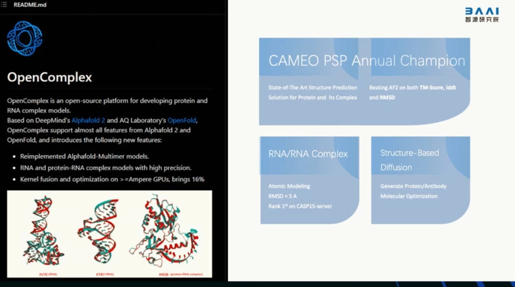 智源在AI for Science领域的探索,致力于人工智能与基础科学深度融合的崭新科研范式,延展不同科学领域的探索边界,造福人类与社会。在相关研究中,智源团队在生命演化和蛋白质结构预测方向作出了重磅成果。OpenComplex 是智源健康计算研究中心打造的面向生物大分子的开源人工智能算法平台,目前已开源蛋白质、RNA 以及复合物的高精度结构预测训练和评测代码。平台还建立了将「蛋白质结构预测」「RNA 结构预测」和「蛋白质-RNA 复合物结构预测」三类任务统一的端到端生物大分子三维结构预测深度学习框架。最近一年,智源 OpenComplex 团队在蛋⽩质结构预测权威竞赛 CAMEO中取得稳定领先成绩,连续在最近月度、季度、半年度和年度评测周期中排名第一。