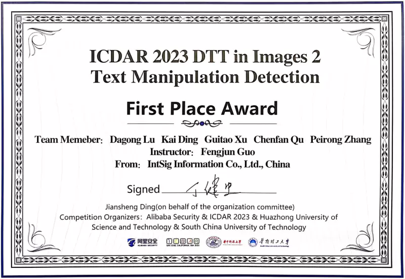现阶段,大量经过人工、AI技术篡改合成的图片被用于散播谣言、经济诈骗、编造虚假资讯。图像内容安全是AI安全的重点领域,如可对图片里文本篡改痕迹进行精准检测,将为图像内容安全提供保障。近期,2023年文档分析与识别国际会议(ICDAR)挑战赛落下帷幕,合合信息战胜了来自全球的上千支参赛团队,获得“文本篡改检测”赛道总冠军。