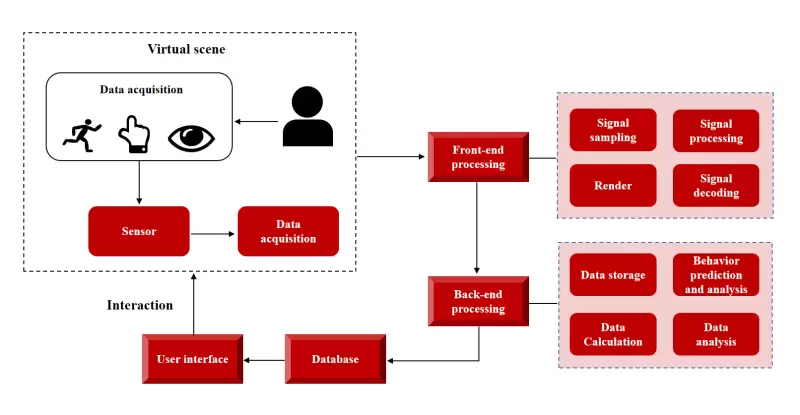 眼球追踪技术和手势识别技术是交互式虚拟现实仿真数字媒体系统中的重要技术,其使得用户更加自然地控制虚拟场景中的物体。眼球追踪技术可以检测用户的视线方向,并将该信息应用于系统中的各种操作,使得用户在虚拟环境中更加自然地进行交互,提升了系统的交互性和参与度。利用手势识别技术可通过检测用户手部的移动和姿态来进行交互控制,让用户更加自然地控制虚拟场景中的物体,提升了系统的体验性和易用性。