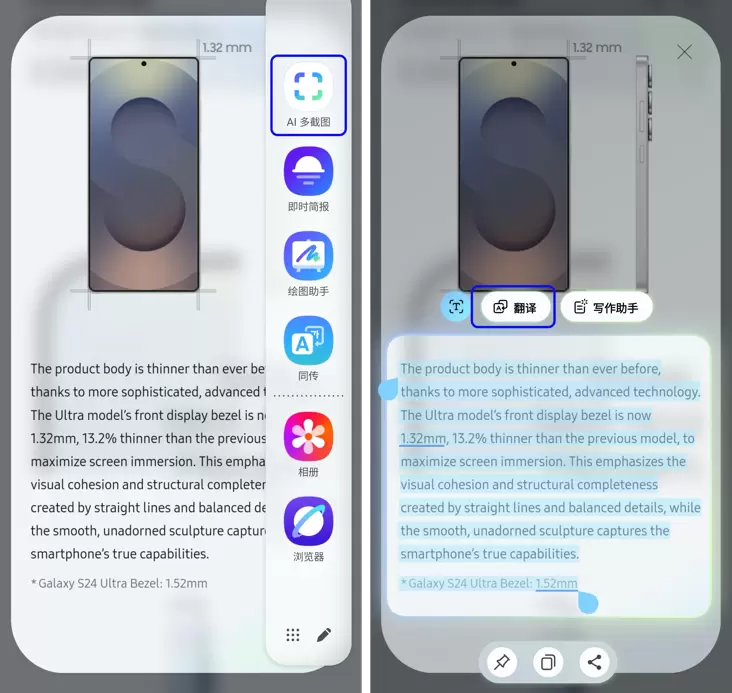 全新的“AI多截图”功能可根据用户行为预判操作意图。比如在浏览外文资料时,用户只需通过AI多截图圈选文字区域,GalaxyAI便可智能识别内容,快速提供翻译、摘要等选项,提升信息处理效率。而在观看短视频时,AI多截图还支持直接圈选视频片段,生成GIF动图,方便用户即时保存或分享到社交平台,让灵感创作更随心所欲。