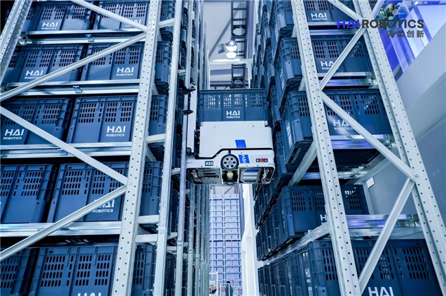 闪攀系统作为海柔最新推出的自动化解决方案,该系统仅靠单一机型闪攀机器人,即可完成垂直攀爬货架、水平地面行走、自主完成货架取箱、运箱出库等动作,并且一台设备可实现自身效率峰值,无需担心因多种机型混合造成的效率耗损。