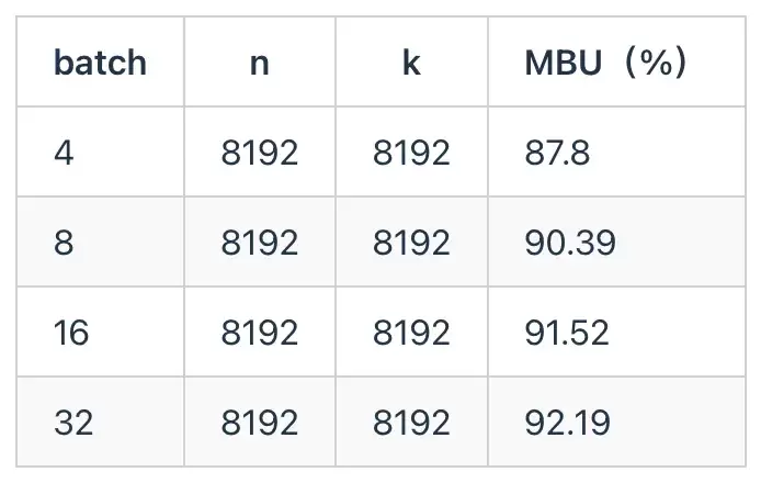 为了测试天数芯片的实际访存带宽利用率,我们使用了LLM decode过程中的典型内存瓶颈算子GEMV并考虑了AWQ量化方法。具体而言,AWQ量化的权重是uint4,激活是fp16,scale groupsize是128。GEMV是decode阶段的算子,即矩阵乘向量,由于序列长度较小,所以一般是内存瓶颈。用AWQ GEMV来测试MBU,实测数据如下: