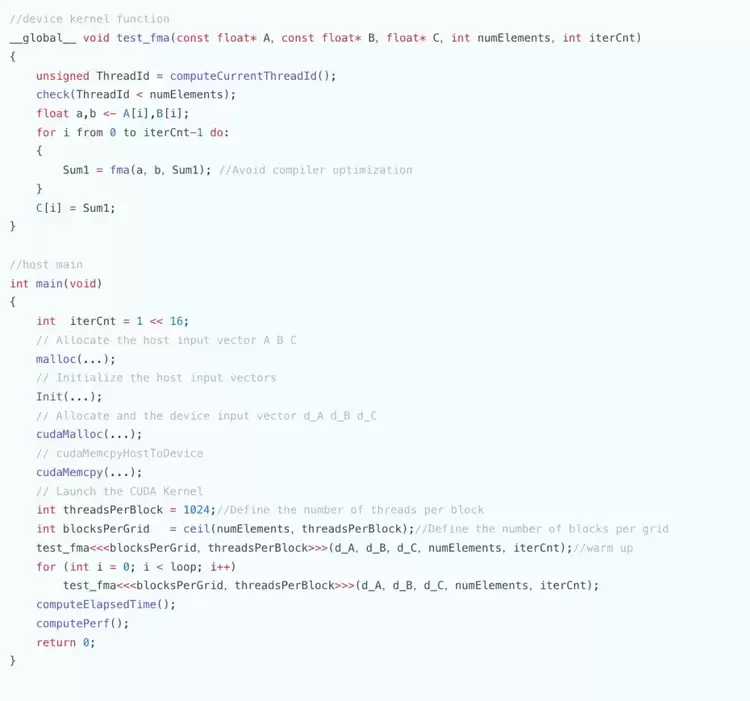 在ByteMLPerf中的byte_micro_perf中,我们提供了测试程序和kernel程序,测试数据和伪代码如下所示。通过运行测试程序可以测算出在FP32数据格式下,BFU和SFU的实际算力为接近100%的算力利用率。由于vector单元的利用率高以及vector和tensor core单元可以并行执行,在大模型训练推理中,天数这款芯片可以很好地将SFU计算隐藏在Tensor core计算中,提高计算效率。