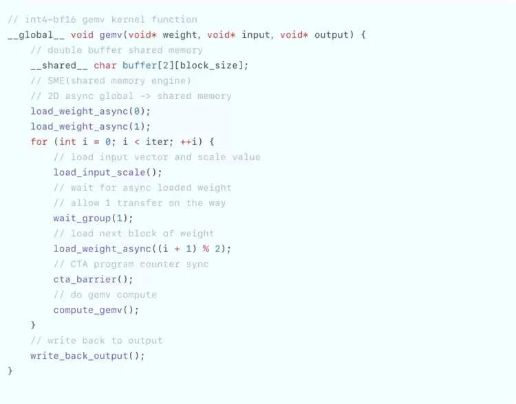 采用 GPGPU 架构,且在设计时考虑CUDA兼容,因此可以高效支持CUDA框架以及相关生态,可快速适配人工智能领域的新模型,在AI等领域具有较强的适应性。缓存复用效率较高。通过精妙的硬件分层设计,达成了类似于 H100 上 DSM 的高效共享内存,且访问延迟显著低于 H100。因此,天数芯片能够以更低的功耗和更小的面积提供更大的算力。调度支持度高,支持通信与计算流程的高度自定义,对通信计算融合、算子融合以及不同内核的灵活调度等方面的支持良好,易于通过软件优化实现硬件利用率的最大化。相较于 A800,SME Engine(一种异步DMA引擎) 和 Scalar Unit 等设计可在更低能耗下实现更高的计算及访存效率,并且在硬件层面能够高效支持非 k - major 的 int8 格式矩阵运算。3.软件优化分析3.1 类CUDA编程生态