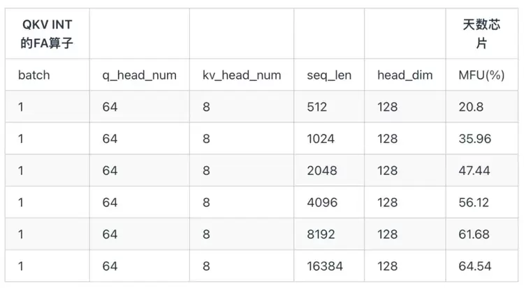 3.6.2 INT8类型MFU对比下表是天数芯片 QKV Int8 类型的 FA 测试结果。