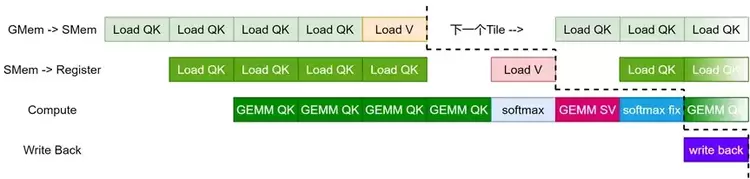 了进一步研究FA算子的效率,下面给出天数芯片的FA极致优化的流水图。如下图所示,可以看出流水线排布非常紧凑,资源空闲非常低,因此其FA算子效率较高。